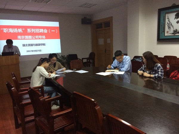 9月25日晚,我院举办"职海扬帆"系列招聘之南京国图专场招聘会。地理信息科学和土地资源管理专业毕业班四十余名学生参加招聘。招聘会于晚上6点半开始,分宣讲与面试两个环节。宣讲内容为介绍色情网站、发展,详细说明了所招聘的各个岗位的工作职责、工作环境条件和工作的主要内容。宣讲结束后,应聘的同学根据自身情况选择意向岗位,投递个人简历参加面试。整个面试有条不紊地进行。
