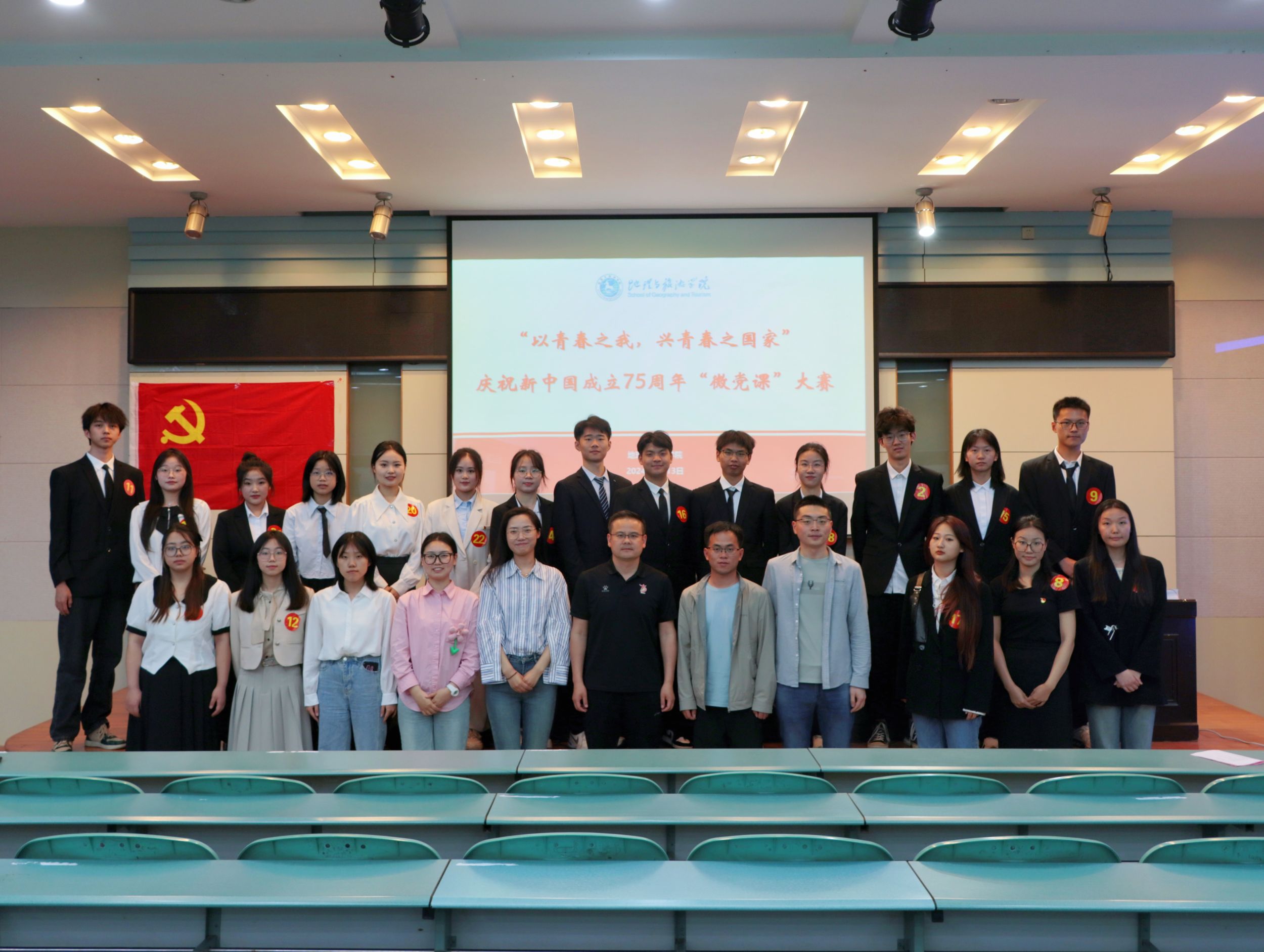 实验楼101报告厅开展了“以青春之我,兴青春之国家”庆祝新中国成立75周年“微党课”大赛。院党委副书记付勇、院团委书记韦银艳及各党支部书记担任评委,党员培训班成员、入党积极分子到场观摩学习。