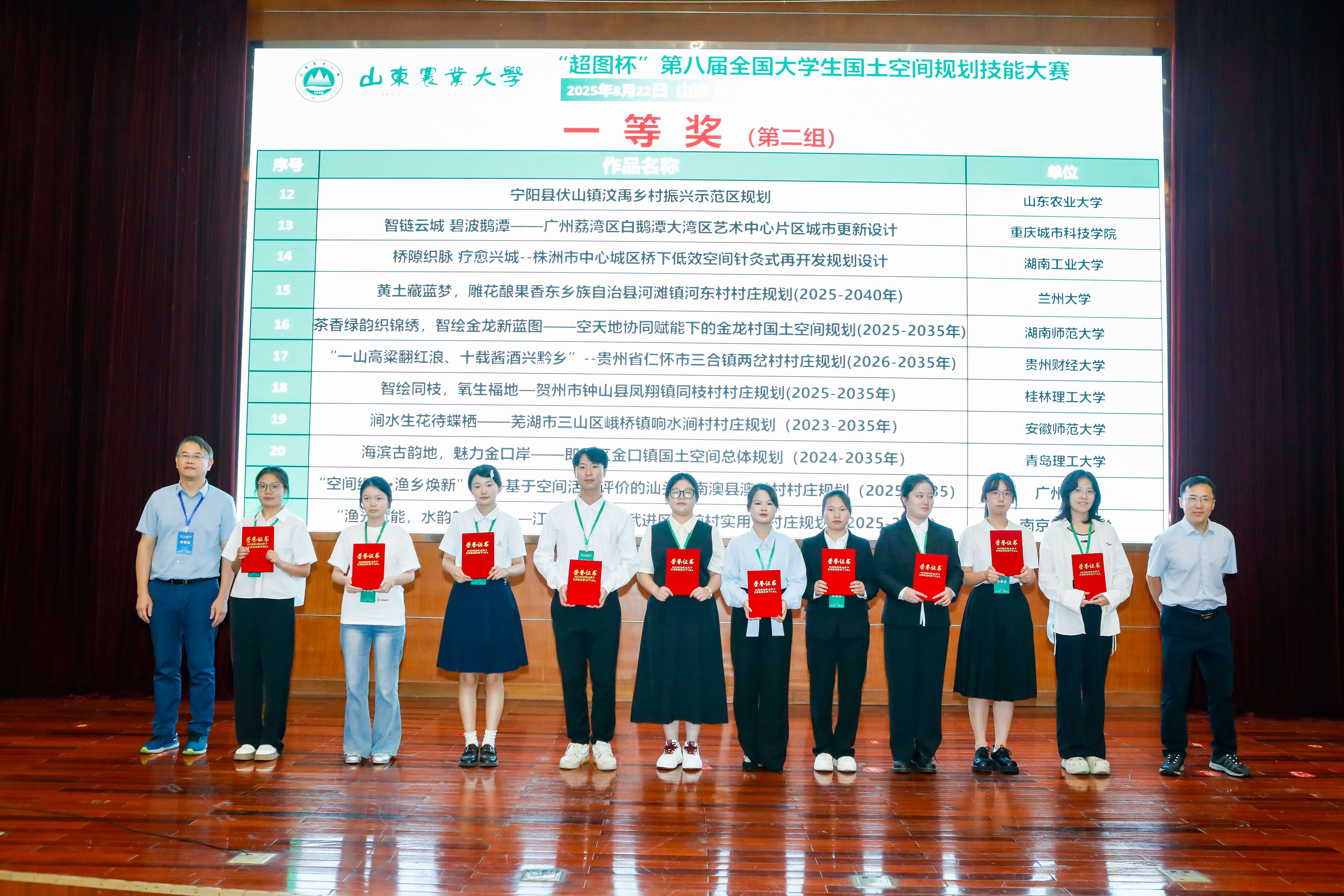 (本网讯 王冰冰)8月21-22日,“超图杯”第八届全国大学生国土空间规划技能大赛决赛在山东农业大学成功举办,大赛汇聚了华中农业大学、南京农业大学、武汉大学、中国人民大学等知名高校的师生代表。截止2025年6月30日,大赛组委会共收到来自88所高校的191件作品,经专家组讨论,共有64件作品入围决赛,我院2022级城乡规划专业本科生团队凭借扎实的专业知识和创新的规划理念顺利晋级决赛,凭借作品《涧水生花待蝶栖——芜湖市峨桥镇响水涧村村庄规划(2023-2035年)》荣获全国一等奖,是我院在该项赛事获得的最高荣誉。参赛队员包括李诗毅、王冰冰、谢梦瑶、林晨希,指导老师为黄秋实、吴九兴。
