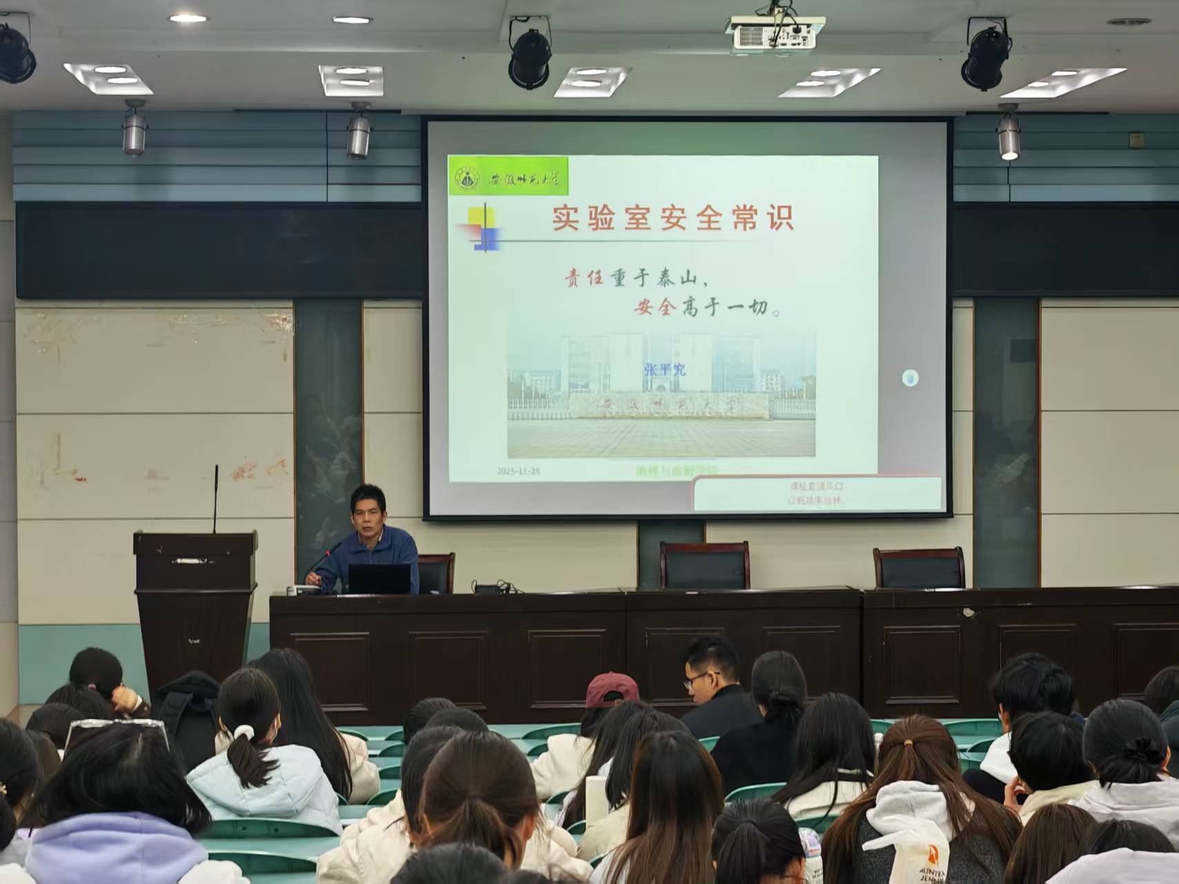 活动期间,原校实验室安全技术督导组专家张平究教授应邀为2025级新生作实验室安全专题讲座,结合真实事故案例,系统讲解了实验室常见隐患、操作规范等安全知识。