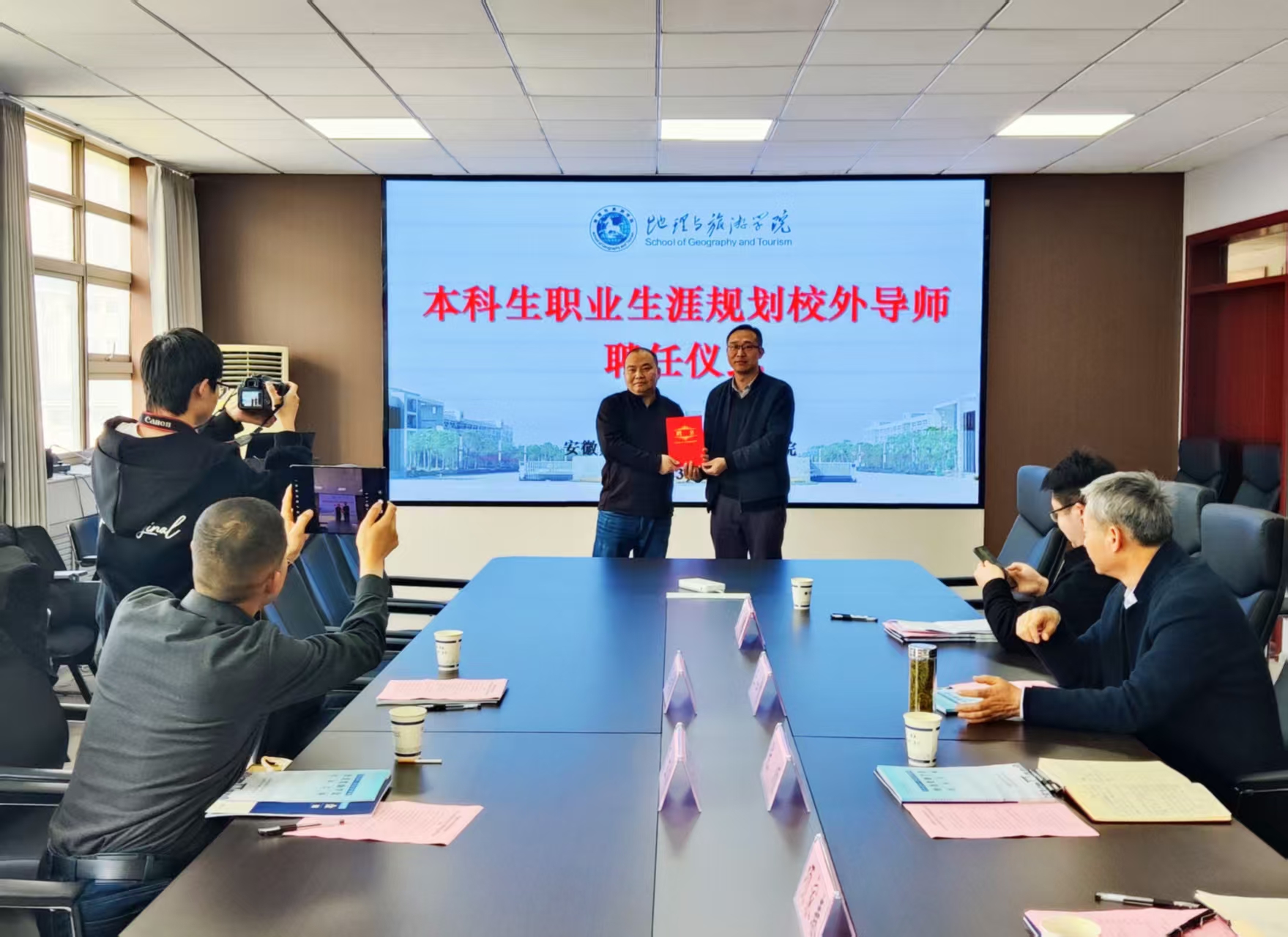 为王结明颁发本科生职业生涯规划校外导师的聘书。王如意勉励获奖受助同学珍惜荣誉,勤奋学习,发奋成才,积极投身公益实践,在青春的赛道上奋力奔跑,取得更大成绩。