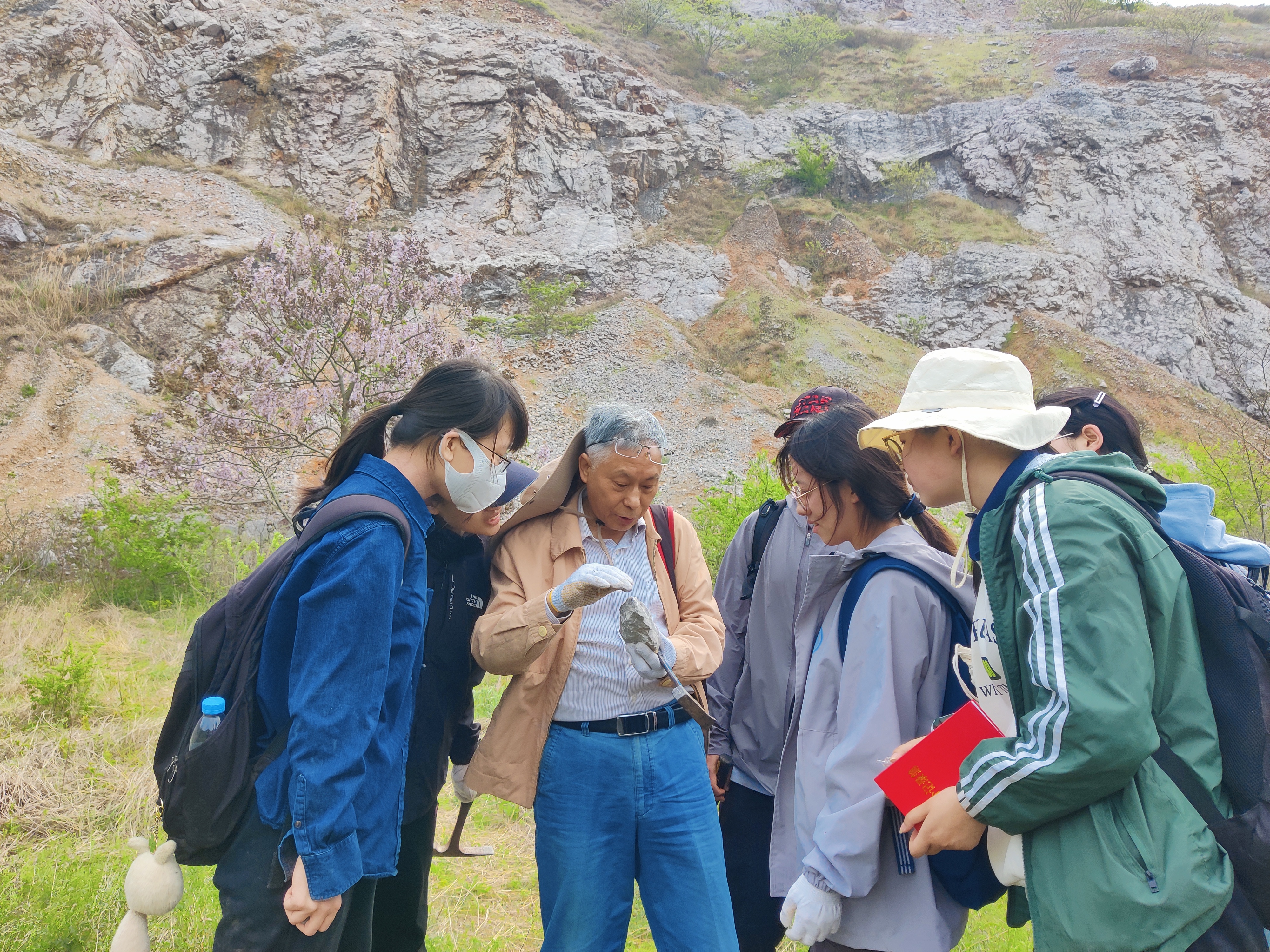 本次实习路线包含巨嶂山、金银洞、鹅头岩、麒麟山、马家山等多处典型地质点位。师生穿行于春日的巢北山野间,克服晴雨交替、气温波动等挑战,以饱满的热情投入每一次观测。老师们以天然露头为教具,现场讲解地层岩性、构造特征与化石识别要点,指导大家规范使用罗盘测量产状、辨认断层痕迹、填写野外记录、绘制地质素描图,让书本上的理论知识在实景中得到充分验证。