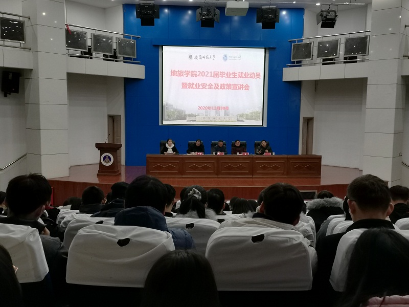 2021届毕业生就业动员暨就业安全及政策宣讲会在敬文图书馆一楼报告厅举行。院党委书记贾冠忠、院长苏勤、院党委副书记乔静、副院长曹卫东出席会议,2021届毕业班辅导员、2021届毕业生到场参会。会议由毕业班辅导员王美主持。