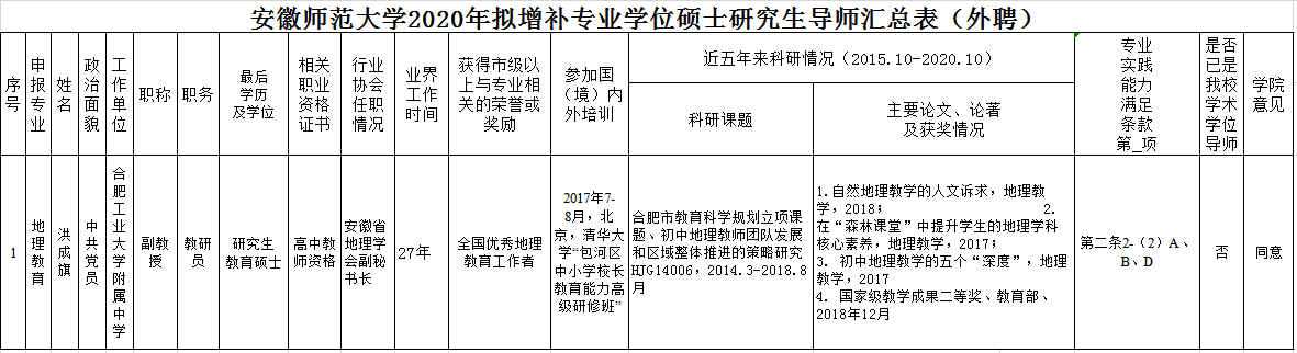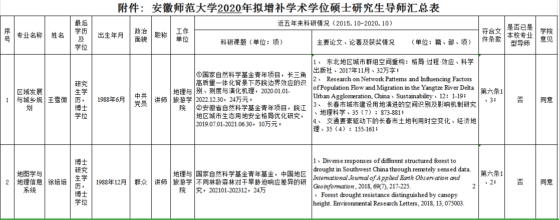 根据校研究生院《关于开展2020年度硕士研究生导师增补工作的通知》(校研字 (2020) 32号)和《安徽师范大学学术学位研究生指导教师遴选办法》(校学位字 (2019) 12号)等文件的精神和要求,色情网站 在坚持公开、公正、公平原则的基础上,通过个人申请和色情网站 教授委员会评审,现确定色情网站 2020年拟增补硕士研究生导师名单。现将名单子以公示。