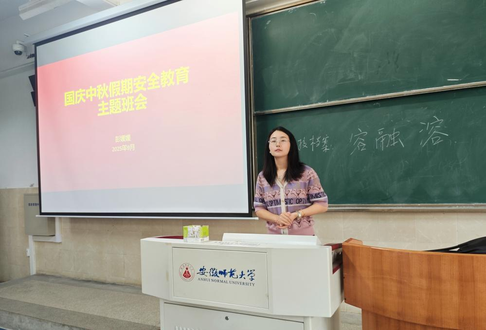 临近国庆中秋假期,彭媛媛强调了放假安排与假期安全注意事项。她指出,全体同学须严格遵循既定规范与操作要求办理请假手续。并且她提醒同学们离校要整理好宿舍卫生,切断电源,消除安全隐患。