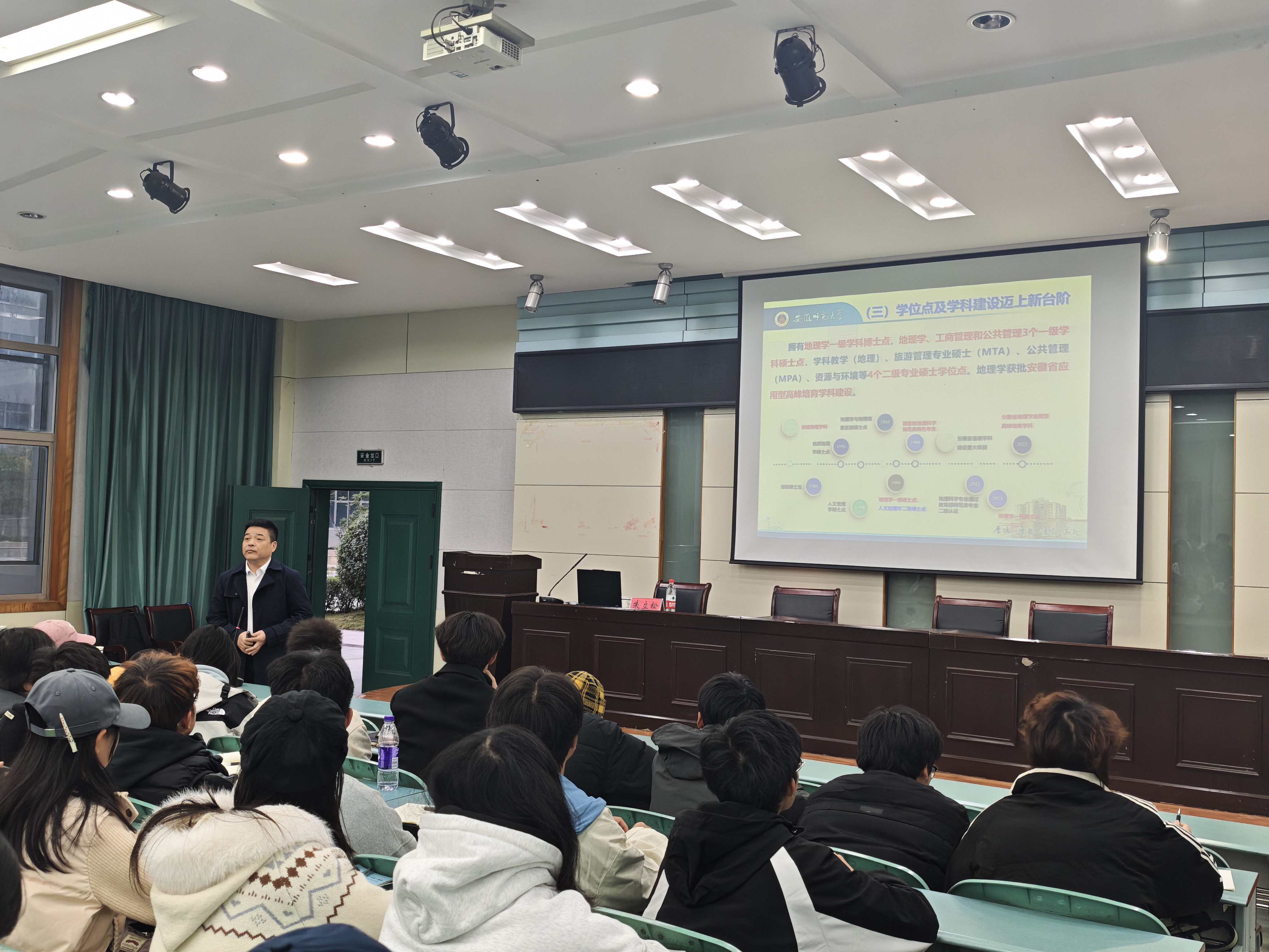 在学科建设与学位点布局方面取得的成就。他详细讲解了旅游管理专业的特色与优势,包括专业定位、课程体系及人才培养模式,帮助新生建立对专业的整体认知。在微观层面,他结合课程设置、学分学时安排及四年学业发展路径,具体说明了学生的学习任务与成长方向,引导大家从大一开始树立规划意识。