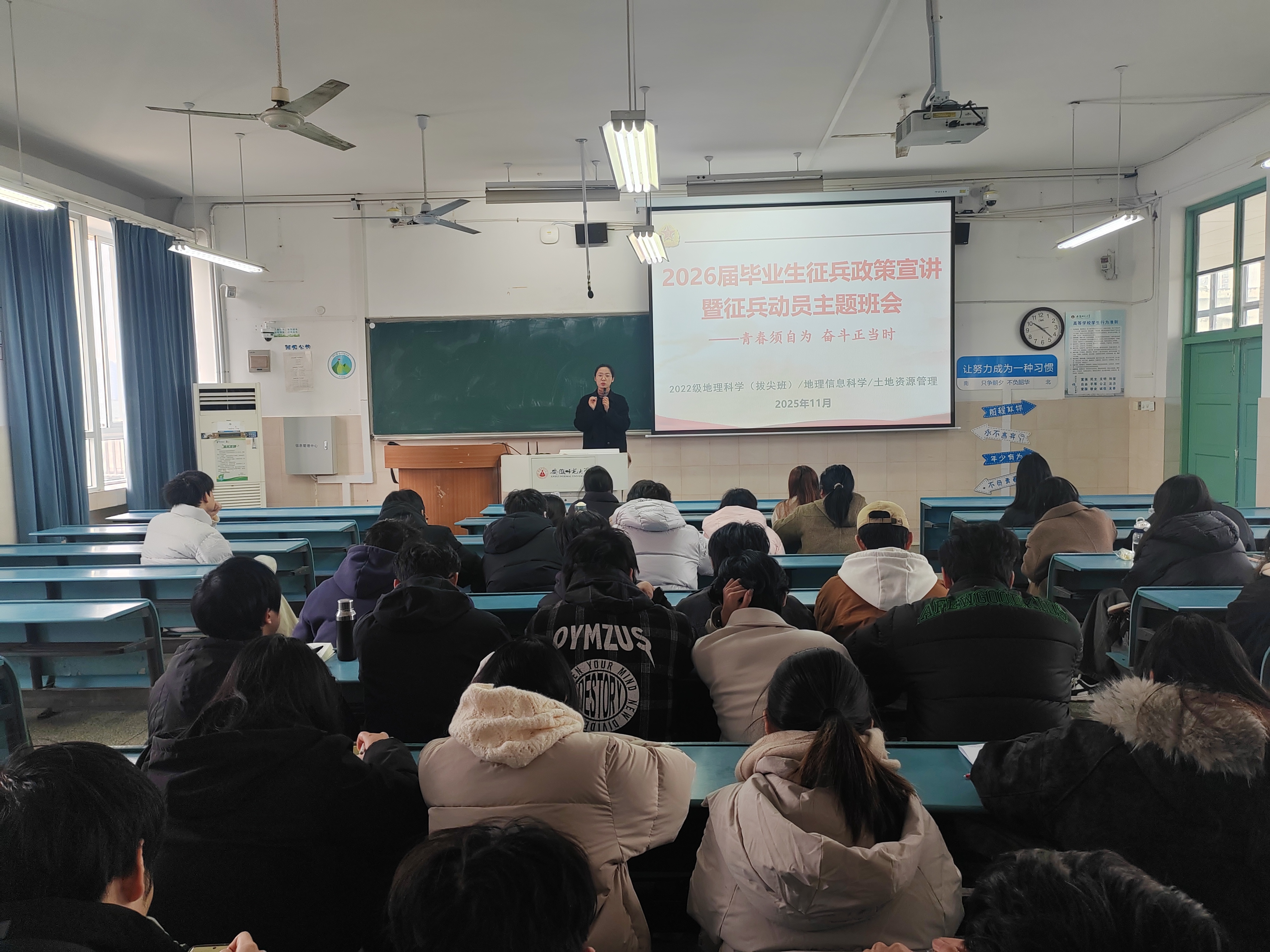为鼓励2026届毕业生投身国防建设,2022级地理科学(拔尖班)、地理信息科学、土地资源管理专业举行毕业生征兵政策宣讲暨动员班会。班会由辅导员陈祥云主讲。