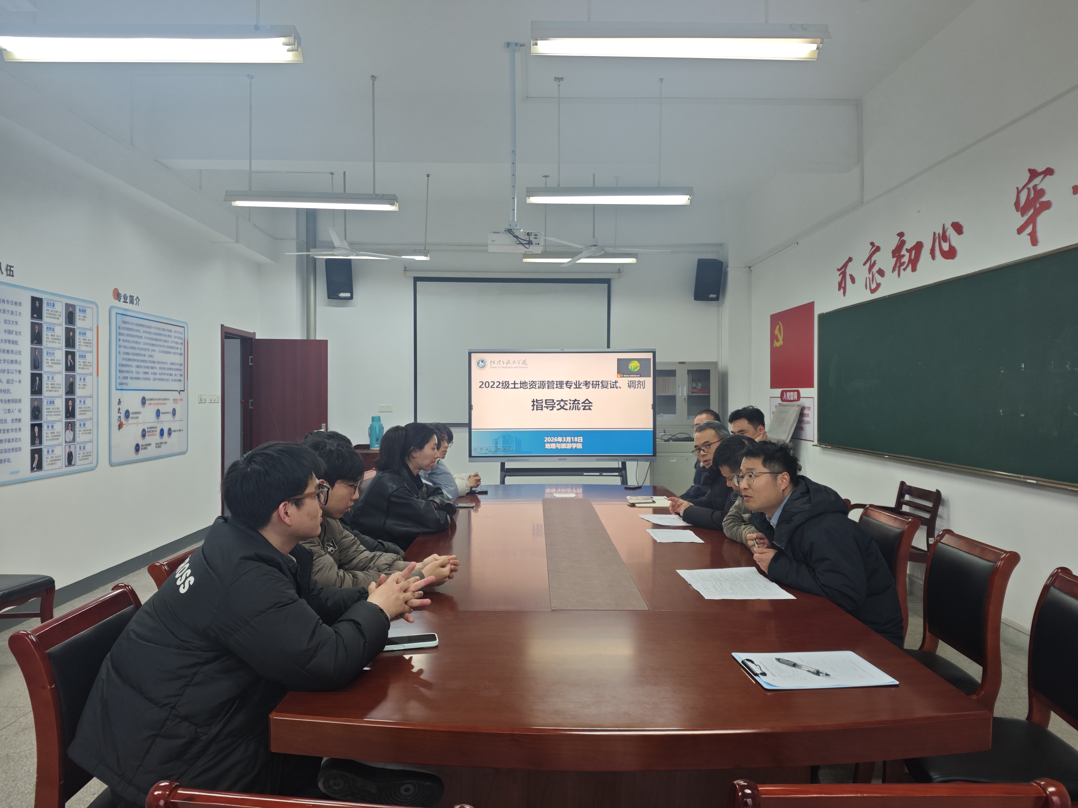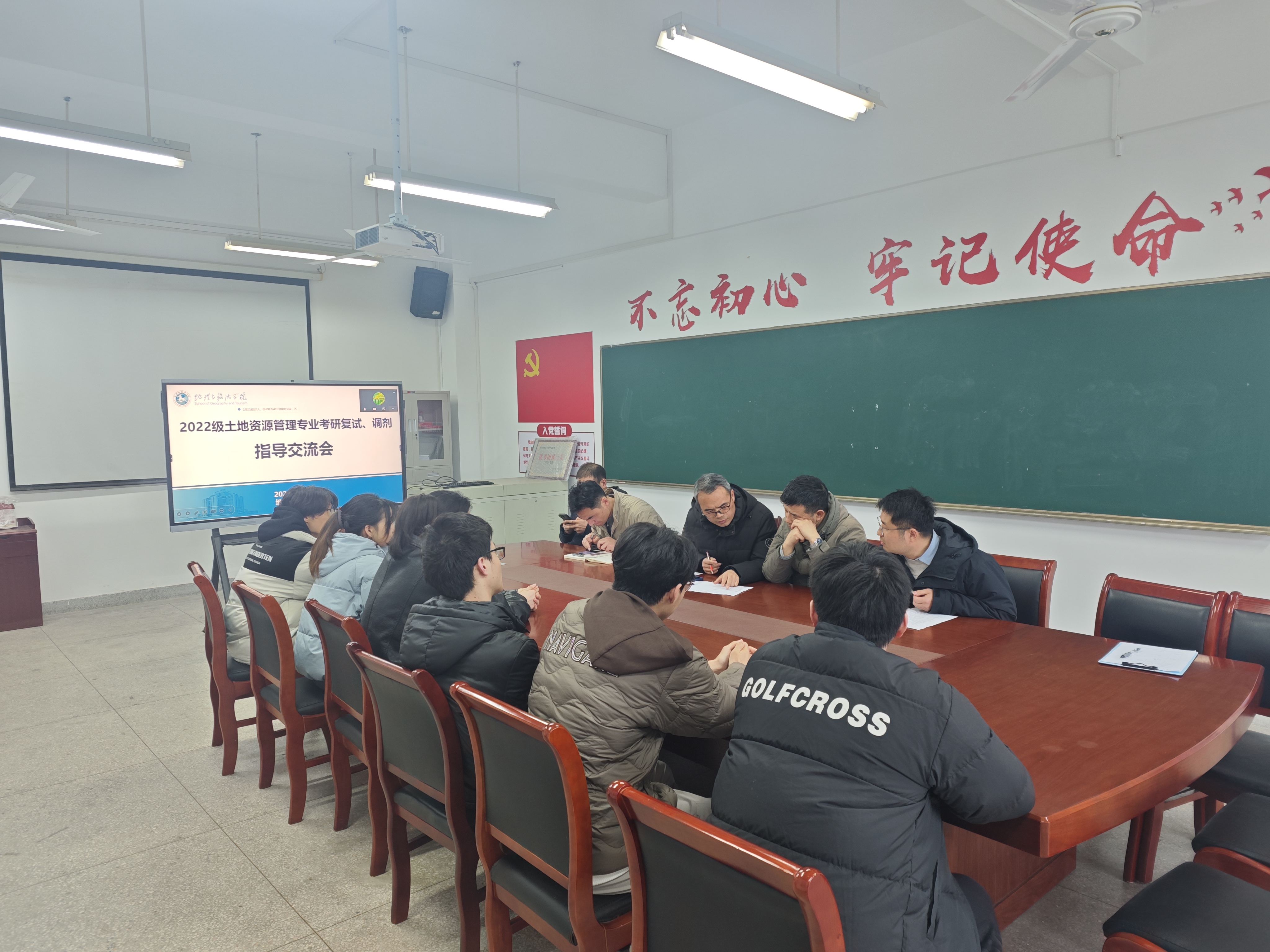 实验楼401召开了2022级土地资源管理专业考研复试调剂指导交流会。会议采用线上线下相结合的方式进行,土地资源管理专业负责人吴九兴,专业教师费罗成、梁栋栋、罗遥、程超,辅导员陈祥云及该专业考研初试成绩达国家线学生参加了会议。